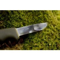 Täydellisesti käteen istuvaksi muotoiltu vihreä kumikahva sormisuojalla. Tarjoaa erinomaisen otteen ja tehostaa työskentelyä. Terän materiaali kylmävalssattu ruotsalainen ruostumaton Sandvik erikoisteräs, eli pysyy erittäin terävänä pitkään.