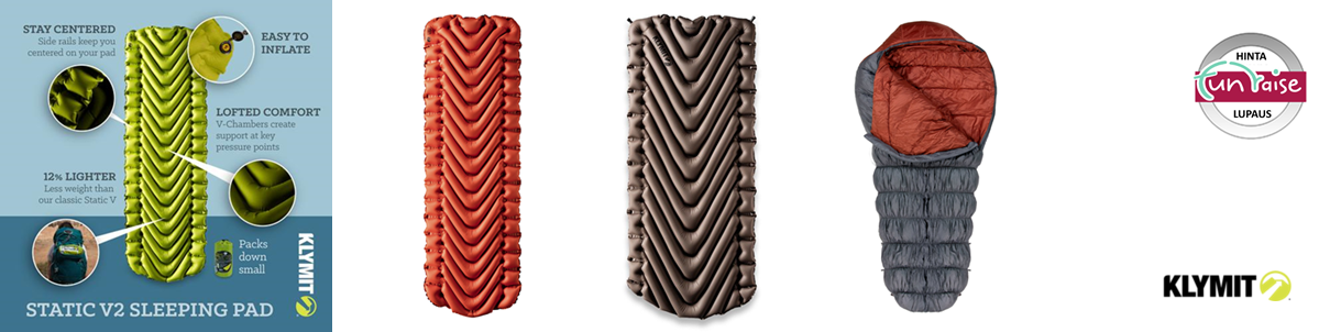 Klymit makuualustat ovat huippuunsa suunniteltuja, ei ylihinnoiteltuja laatuunsa nähden. Alkuperäisestä Static V®: n alusta lähtien, kaikki mallit on suunniteltu kehon rakenteelle sopivaksi. Malleja löytyy useita, oli tarve ultra kevyttä vaativasta seikkailusta urheilusta automatkailuun