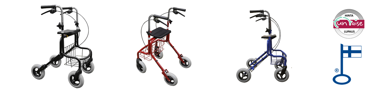 Valikoimamme Mauno ja Paavo rollaattorit on valmistettu Suomessa ja niille on myönnetty avainlippu. Kävelytelineen valinnassa tulee kiinnittää erityistä huomiota käsitukien korkeudensäätöön. Väärä korkeus rasittaa muun muassa alaselkää turhaan. Näiden molempien mallien säädettävyys on hyvä, eli 77 – 91 cm. Malleista Mauno on hieman kapeampi eli 55 cm ja Paavo leveämpi, 62 cm. Kapeampi rollaattori on hieman kätevämpi sisätiloissa, kun taas leveämpi malli on suunniteltu eritysesti sopimaan hyvin ulkokäytössä, alustasta rippumatta. Se soveltuu niin asfaltille, soralle kuin lumellekin.